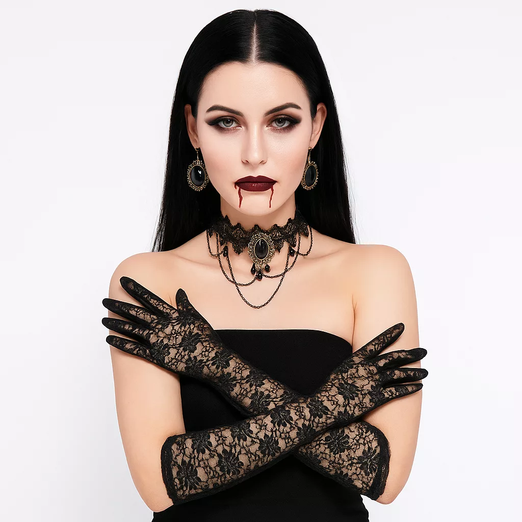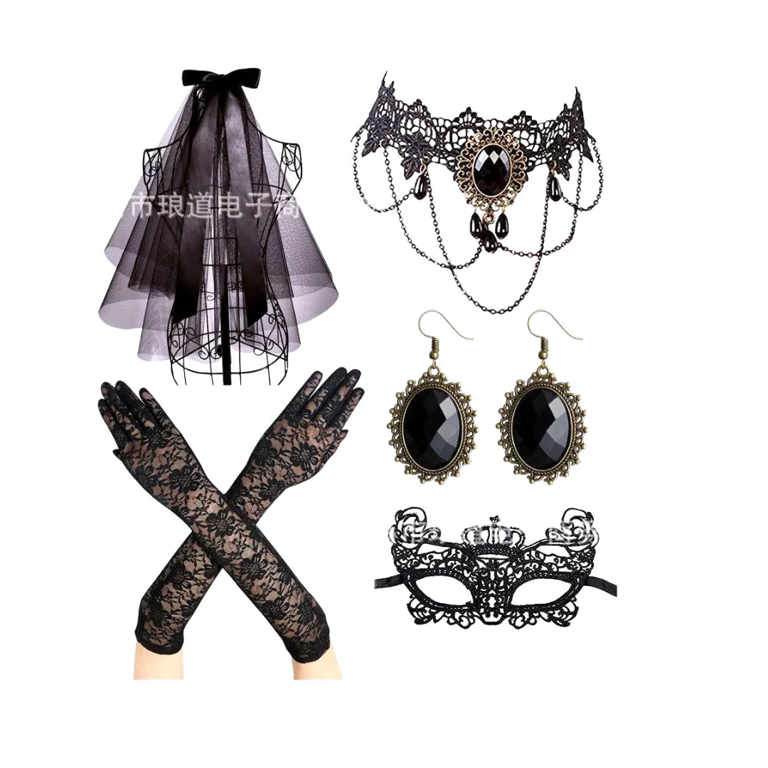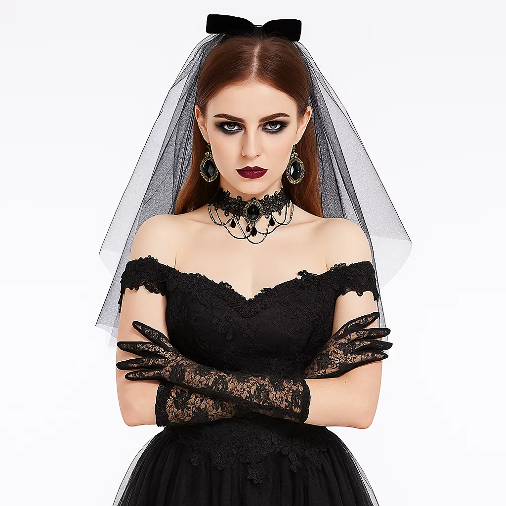 Incluye: velo negro, guantes encaje negro, collar gótico, aretes góticos y antifaz